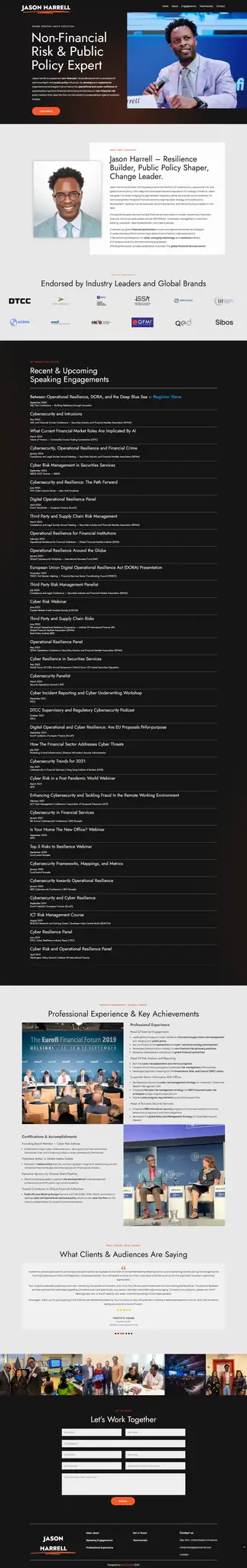 Jason Harrell is a global thought leader in cybersecurity, operational resilience, and non-financial risk. Through his firm, JAH Secure Solutions, LLC, Jason offers consulting, policy advocacy, and keynote speaking to top-tier organizations, industry associations, and government bodies worldwide.